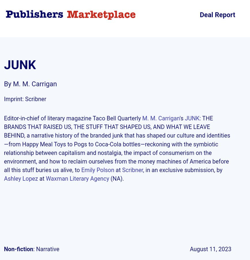 Then in April, an editor from a big 5 imprint asked my agent what I was working on. Now the dream sentences were happening to me. I’m writing a book called JUNK, about the relationship between nostalgia and identity and capitalism.